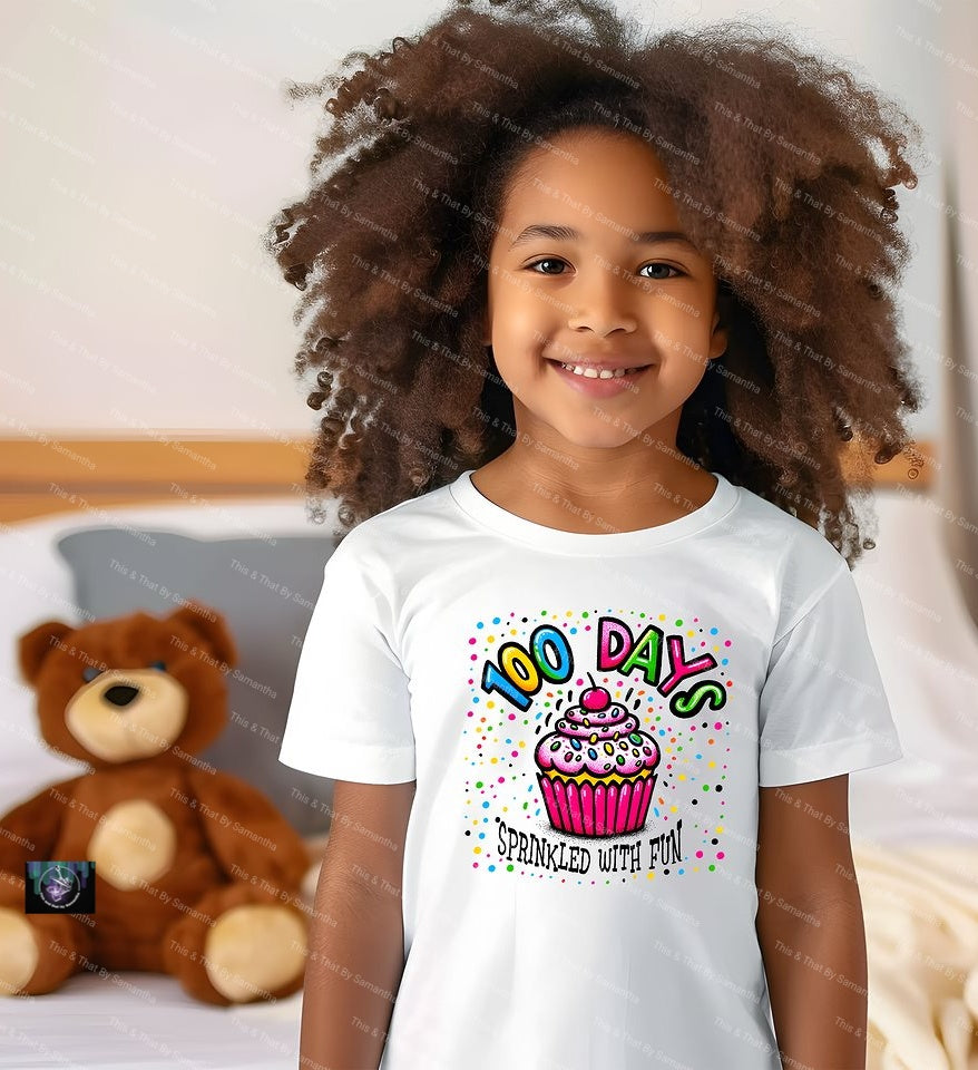 Description: Celebrate your child's 100th day of school with our Kids 100th Day of School cupcake and sprinkles shirt! Perfect for adding a touch of fun and playfulness to their special day.