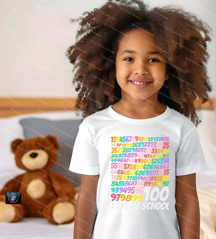 Description: Celebrate your child's 100th day of school with this unique t-shirt! Featuring numbers 1 to 100, it's a fun way to mark this milestone and show off their academic achievement (and your good parenting) in a playful way. No more boring school shirt days!